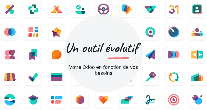 Odoo est un logiciel de gestion tout-en-un : on y retrouves CRM, devis/factures, achats, stocks, comptabilité française, site web, e-commerce, marketing. On peut démarrer petit (2-3 apps) et ajouter le reste quand l’entreprise grandit.
